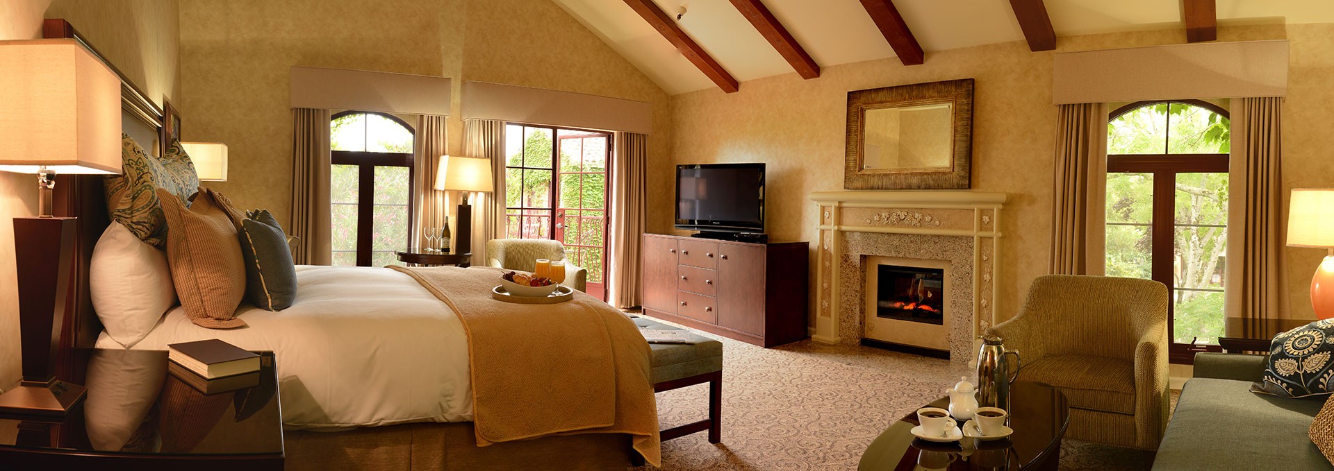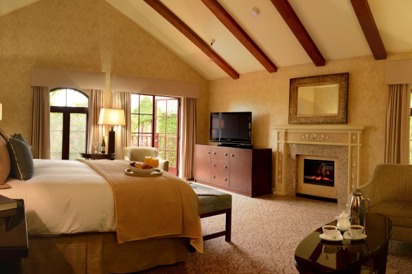 Fireplace Jacuzzi Upper level with balcony and views of the beautifully landscaped grounds add to the charm and ambiance of your spacious fireplace-Jacuzzi room – 440 sq.ft. Complete with vaulted ceilings and a seating area, these rooms include a Cal king-sized bed with featherbed and down bedding, desks, environmentally friendly electric fireplace, luxurious amenities, bathrobes, an oversized soaking jetted Jacuzzi® bathtub/shower combination, make-up vanity small refrigerator, flat screen HDTV 42″ television with DVD and CD player, and wireless Internet access. A 1/2 bottle of wine is included in the room rate. Please see our Amenities page for more details. Image Gallery