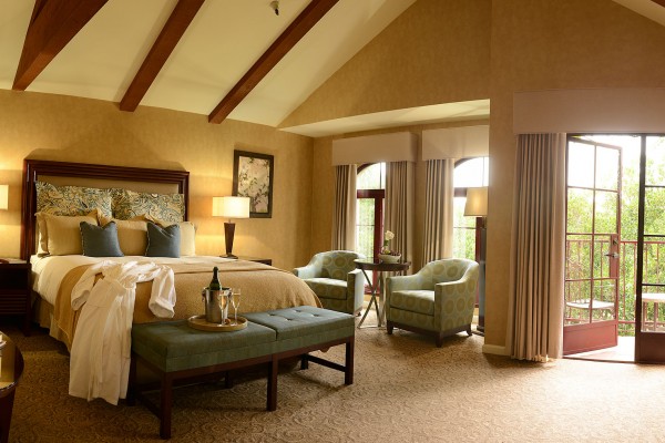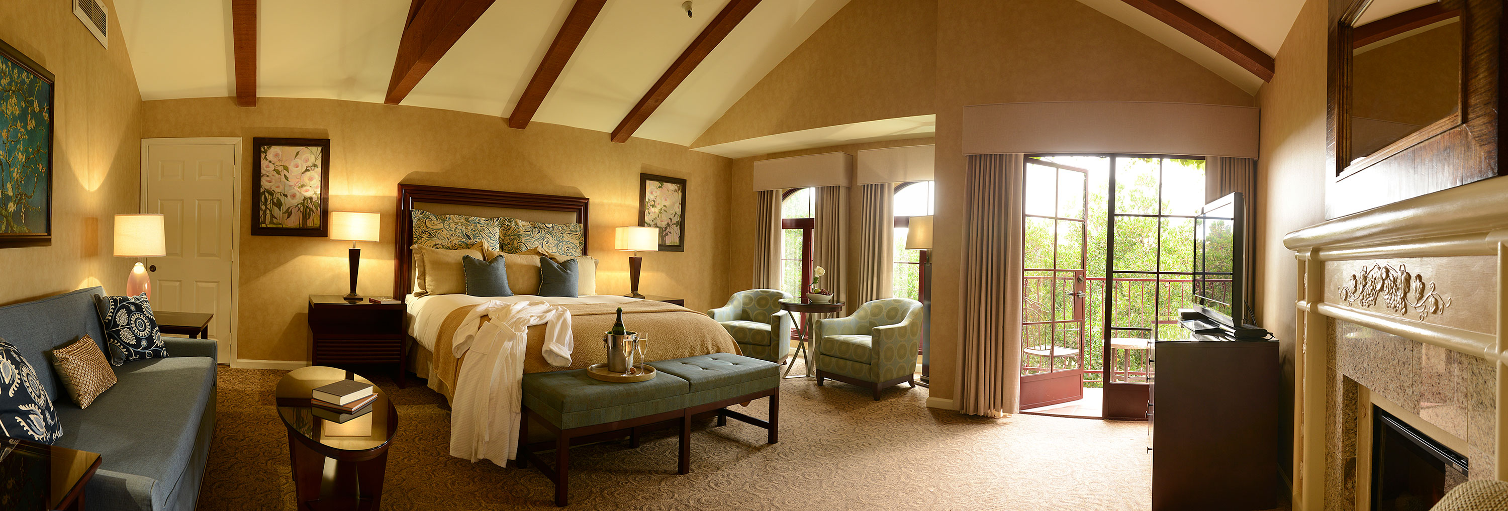 Junior SuiteOur Junior suites feature double French doors that open to a private patio or balcony with views of the meticulous landscape. These luxurious, spacious suites include a Cal king-sized bed with featherbed and down bedding, environmentally friendly electric fireplace, sitting area with sofa, writing alcove, roomy bathroom with Jacuzzi® Roman tub and separate shower, luxurious amenities, bathrobes, flat screen HDTV 42″ television with DVD and Ipod player, small refrigerator, two-line telephones with data port, and complimentary wireless Internet access. A half bottle of wine is included in the room rate.Please see our Amenities page for more details.Image Gallery