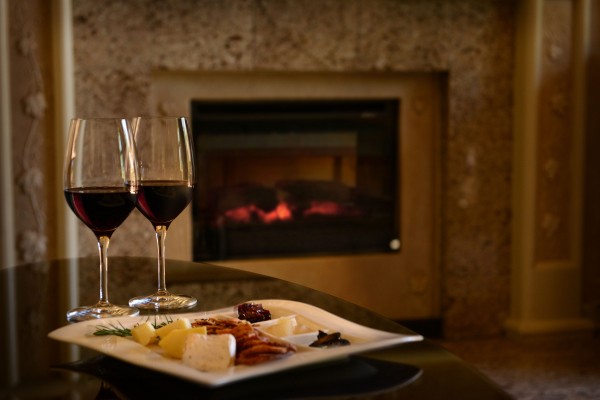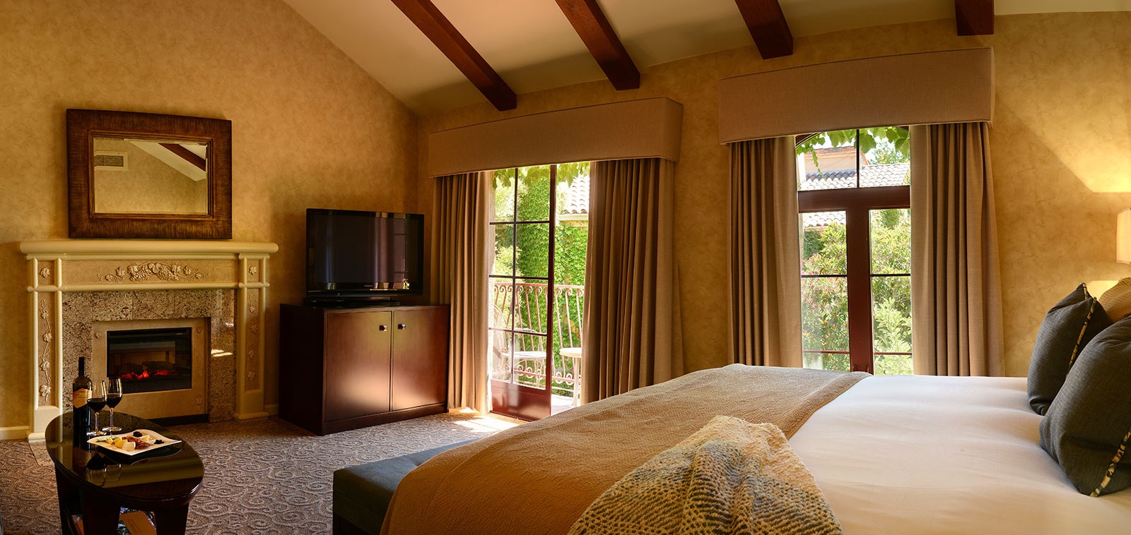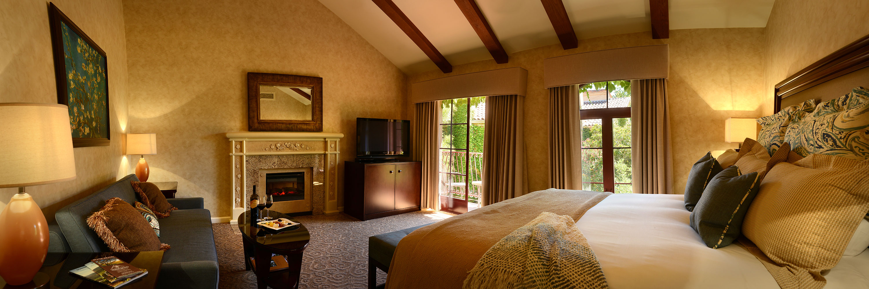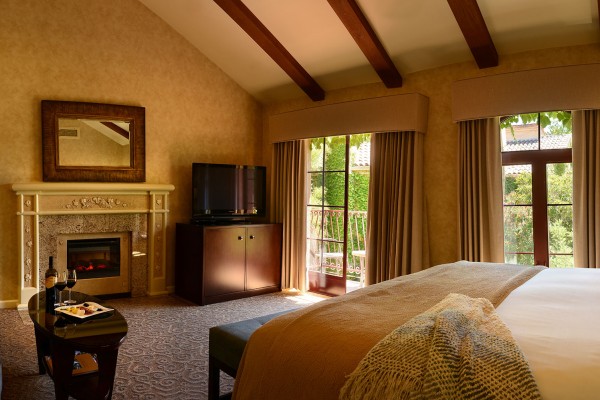 Upstairs FireplaceViews of vineyards, the surrounding landscape, or flower gardens add to the charm and ambiance of your upstairs fireplace room. Complete with vaulted ceilings, these spacious rooms include a Cal king-sized bed with featherbed and down bedding, sitting areas and/or desks, environmentally friendly electric fireplace, luxurious amenities, bathrobes, an oversized soaking bathtub/shower combination, small refrigerator, flat screen HDTV 42″ television with DVD and CD player, and wireless Internet access. A half bottle of wine is included in the room rate.Please see our Amenities page for more details.Image Gallery