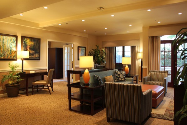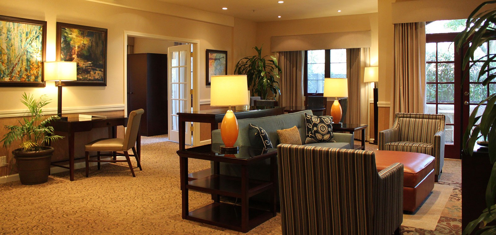 Vintners Suite The grand one-bedroom Vintners Suite is 940 sq.ft. featuring double French doors that open to a large enclosed private patio fit for entertaining with comfortable outdoor furnishings and lounge chairs. This luxurious suite has a spacious living room and dining area with an environmentally friendly electric fireplace, flat screen HDTV 42” television above and writing desk. The private bedroom include a Cal king-sized bed with featherbed and down bedding, make-up desk, flat screen HDTV 42″ television with DVD and Ipod player, personal refrigerator, two-line telephones with data port, and complimentary wireless Internet access. The beautiful well-appointed bathroom features an oversize soaking jetted Jacuzzi® bathtub/shower combination and separate commode, luxurious amenities and bathrobes. A 1/2 bottle of wine is included in the room rate. Please see our Amenities page for more details. Image Gallery